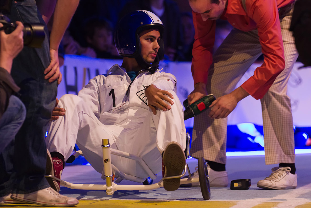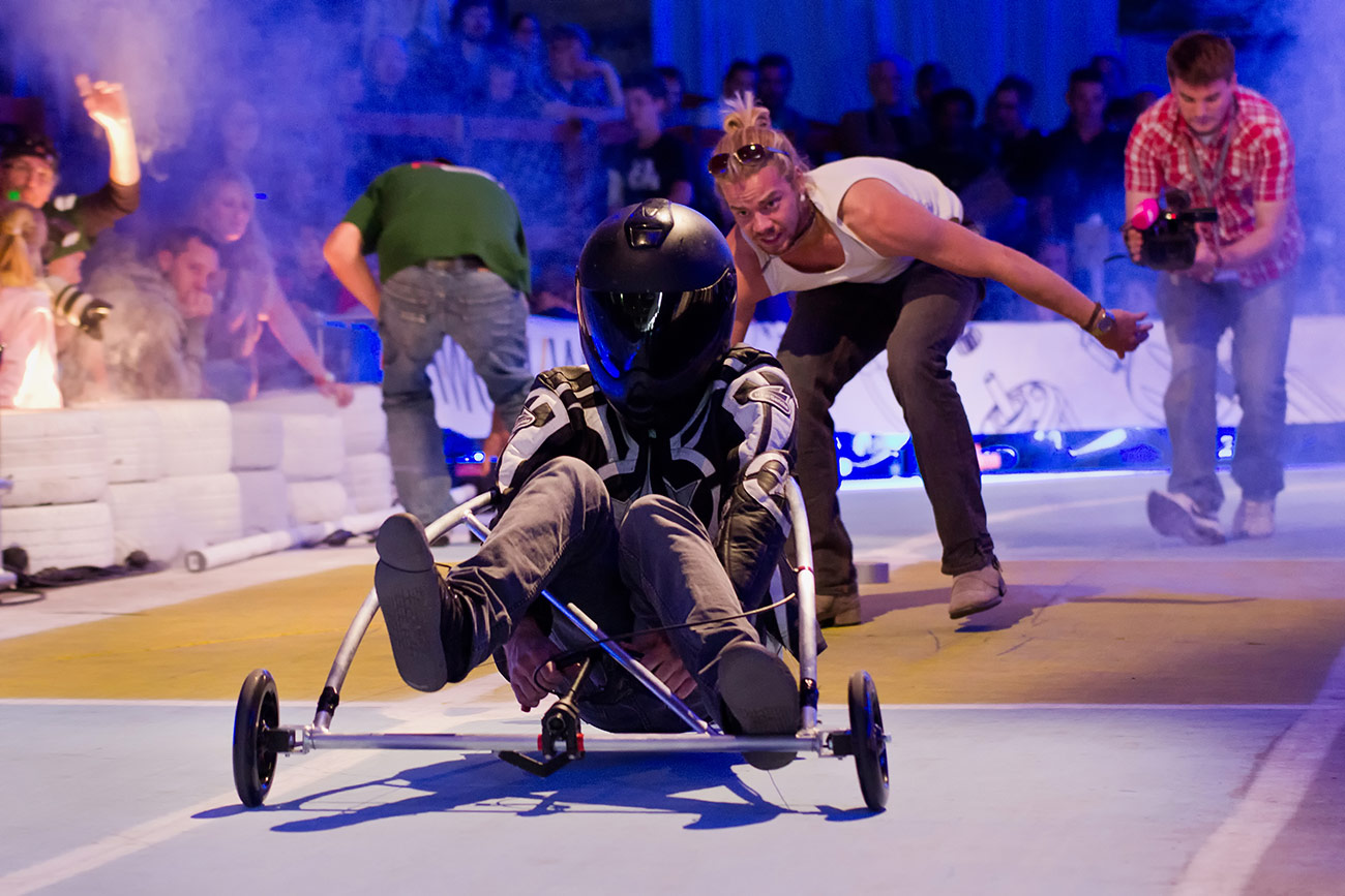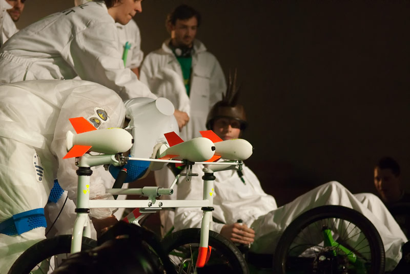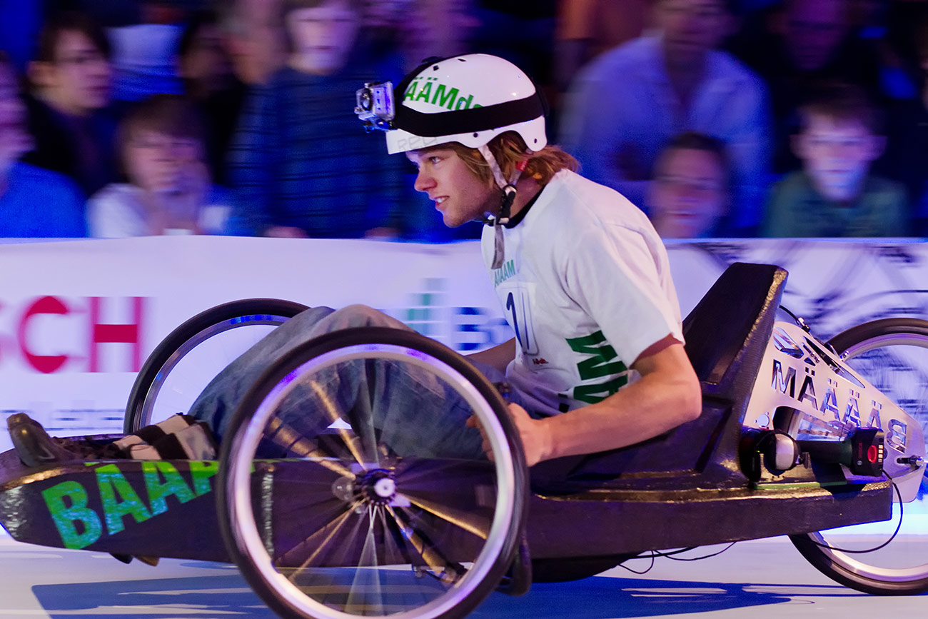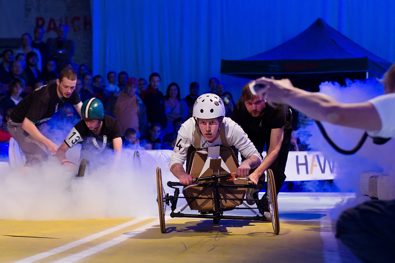 „Die Idee des Akkuschrauberrennens ist ebenso einfach wie überraschend: Gefährte, die von Akkuschraubern angetrieben werden, treten gegeneinander an. Die Fakultät Gestaltung der HAWK Hildesheim richtet das Rennen in 2009 schon zum sechsten Mal aus.“
