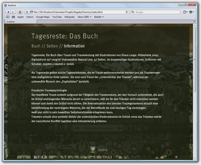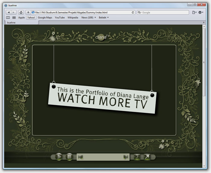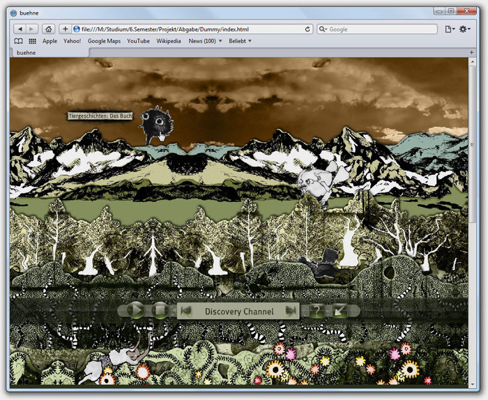 Wie könnte eine Portfolio-Seite ohne klassische Menuführung aussehen? Wie halte ich möglichst lange einen User auf meiner Seite? Unter diesen Fragestellungen entwickelte ich eine interaktive Portfolio-Seite names „Watch More TV“. Wie der Name bereits verrät, orientiert sich das Konzept am Fernsehen. Schon das Interface kommt als Videoplayer daher. Es gibt einen Play- und einen Stoppbutton. Anstatt alle Arbeiten in verschiedene Kategorien zu ordnen sind sie hier in Fernsehkanäle untergliedert. Kanal Eins ist der Discovery Channel. Es läuft gerade eine Tiersendung und unerforschte Wesen wandern durch eine Landschaft. Der User kann die Landschaft eigenständig erforschen, denn sie lässt sich per Drag & Drop verschieben. Die Wesen sind klickbar und führen zum eigentlichen Portfolio-Inhalt. Denn in Wirklichkeit sind sie animierte Elemente aus verschiedenen Illustrationen. Der User kann zwischen den verschiedenen Kanälen umschalten und so das gesamte Portfolio spielerisch entdecken.